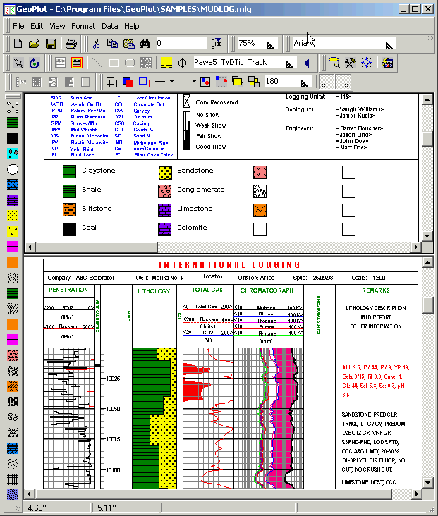 The GeoPlot Log Drafting Software is a feature rich Integrated Log Development Environment (ILDE) used for creating and editing an endless variety of well logs. GeoPlot utilizes the power and reliability of Windows NT/2000 to produce logs many times faster than previous log drafting packages while keeping the exported file sizes to a minimum to facilitate distributing exported log files over a shared network environment. Designing logs is accomplished by dragging and dropping graphical objects and text onto a preview screen that displays the log exactly as it will appear on the printer. GeoPlot automatically retrieves the latest data from the DLS online database while plotting the log to the screen. Below is a screenshot of the GeoPlot software displaying the toolbars, top design pane and bottom preview pane.